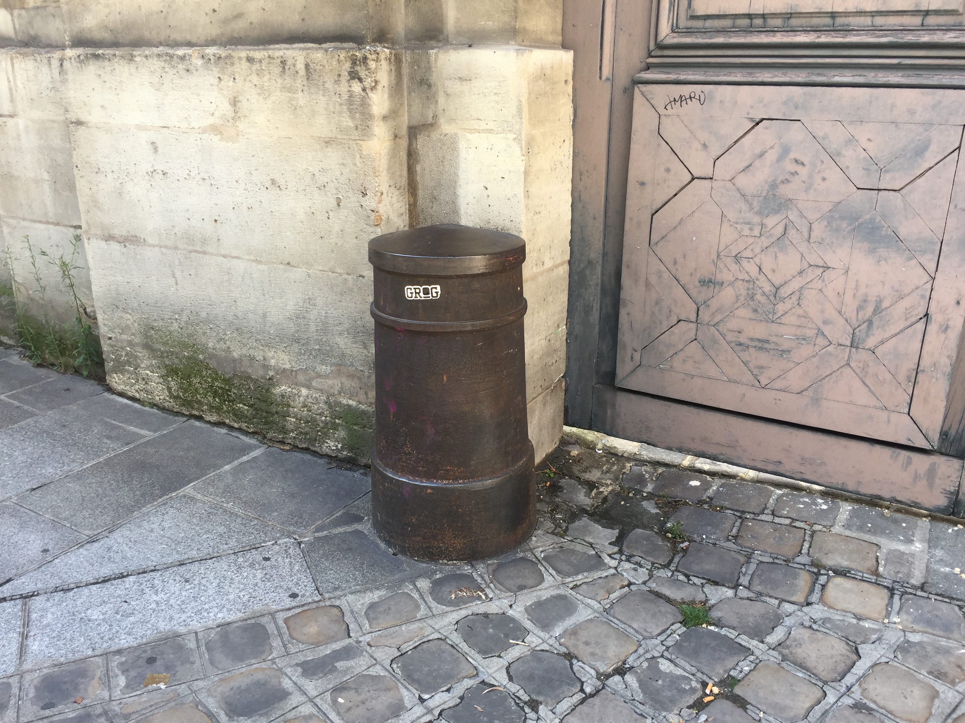 These days they’re functionless, but nice to spot as you walk around the city. Wikipedia says they’re called “guard stones” in English, but I’m sticking with the much nicer sounding chasse-roues for now.